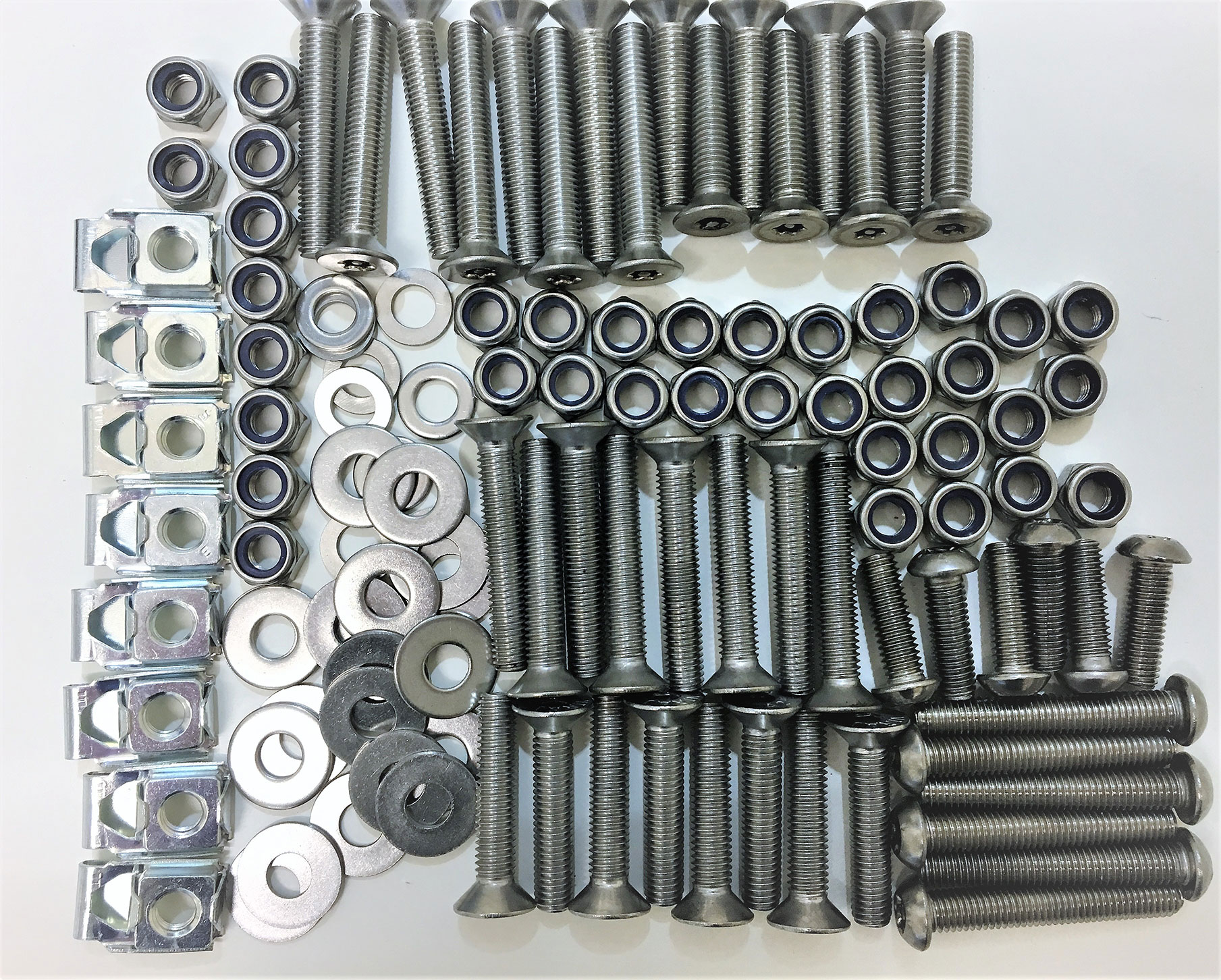 “A PACK OF STAINLESS STEEL DOOR HINGE SCREWS, NUTS, WASHERS AND J CLIPS FOR DEFENDER 110 COUNTY STATION WAGON 4 SIDE DOORS/ 8 HINGES